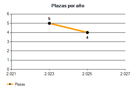 En los siguientes gráficos se puede ver la evolución del número de convocatorias y plazas convocadas por el ayuntamiento de Santiago-Pontones de los últimos años pudiéndose observar una caída del 50,00% desde el año 2023 hasta el 2025 en número de convocatorias y una caída del 20,00% en número de plazas convocadas.