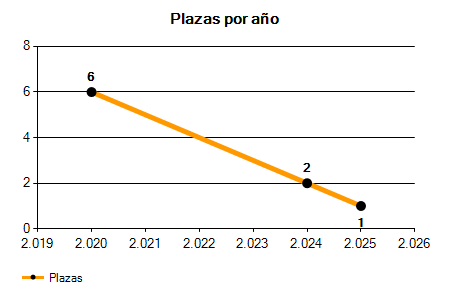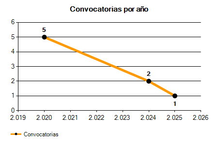 En los siguientes gráficos se puede ver la evolución del número de convocatorias y plazas convocadas por el ayuntamiento de Santiso de los últimos años pudiéndose observar una caída del 80,00% desde el año 2020 hasta el 2025 en número de convocatorias y una caída del 83,33% en número de plazas convocadas.