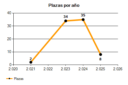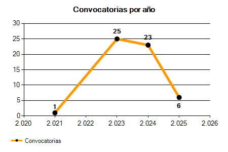 En los siguientes gráficos se puede ver la evolución del número de convocatorias y plazas convocadas por el ayuntamiento de Segorbe de los últimos años pudiéndose observar un crecimiento del 500,00% desde el año 2021 hasta el 2025 en número de convocatorias y un crecimiento del 300,00% en número de plazas convocadas.