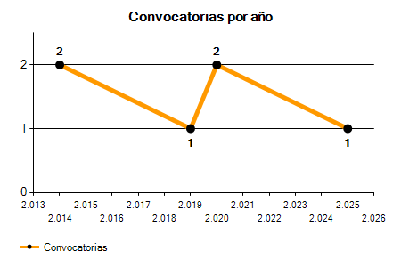 En los siguientes gráficos se puede ver la evolución del número de convocatorias y plazas convocadas por el ayuntamiento de Simancas de los últimos años pudiéndose observar una caída del 50,00% desde el año 2014 hasta el 2025 en número de convocatorias y una caída del 50,00% en número de plazas convocadas.