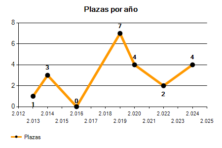 En los siguientes gráficos se puede ver la evolución del número de convocatorias y plazas convocadas por el ayuntamiento de Suances de los últimos años pudiéndose observar una caída del 100,00% desde el año 2013 hasta el 2025 en número de convocatorias y una caída del 100,00% en número de plazas convocadas.