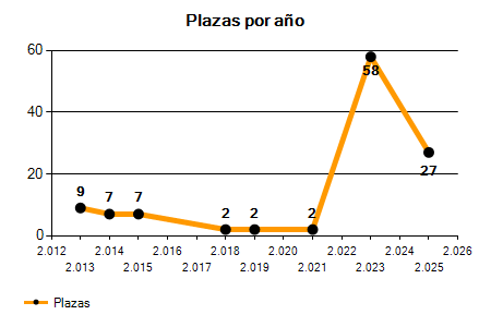 En los siguientes gráficos se puede ver la evolución del número de convocatorias y plazas convocadas por el ayuntamiento de Tarifa de los últimos años pudiéndose observar una caída del 66,67% desde el año 2013 hasta el 2025 en número de convocatorias y un crecimiento del 200,00% en número de plazas convocadas.