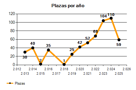 En los siguientes gráficos se puede ver la evolución del número de convocatorias y plazas convocadas por el ayuntamiento de Tarragona de los últimos años pudiéndose observar un crecimiento del 366,67% desde el año 2013 hasta el 2025 en número de convocatorias y un crecimiento del 96,67% en número de plazas convocadas.