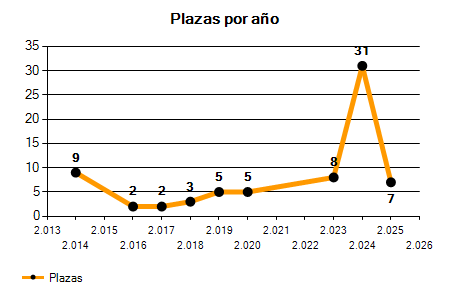En los siguientes gráficos se puede ver la evolución del número de convocatorias y plazas convocadas por el ayuntamiento de Tías de los últimos años pudiéndose observar una caída del 25,00% desde el año 2014 hasta el 2025 en número de convocatorias y una caída del 22,22% en número de plazas convocadas.