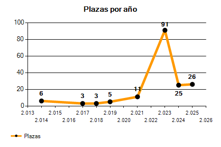 En los siguientes gráficos se puede ver la evolución del número de convocatorias y plazas convocadas por el ayuntamiento de Torre del Campo de los últimos años pudiéndose observar un crecimiento del 500,00% desde el año 2014 hasta el 2025 en número de convocatorias y un crecimiento del 333,33% en número de plazas convocadas.