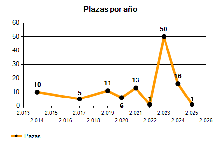 En los siguientes gráficos se puede ver la evolución del número de convocatorias y plazas convocadas por el ayuntamiento de Villanueva de la Serena de los últimos años pudiéndose observar una caída del 75,00% desde el año 2014 hasta el 2025 en número de convocatorias y una caída del 90,00% en número de plazas convocadas.
