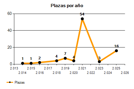 En los siguientes gráficos se puede ver la evolución del número de convocatorias y plazas convocadas por el ayuntamiento de Villanueva del Arzobispo de los últimos años pudiéndose observar un crecimiento del 1.500,00% desde el año 2014 hasta el 2025 en número de convocatorias y un crecimiento del 1.500,00% en número de plazas convocadas.