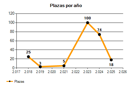 En los siguientes gráficos se puede ver la evolución del número de convocatorias y plazas convocadas por el ayuntamiento de Villarrobledo de los últimos años pudiéndose observar una caída del 60,00% desde el año 2018 hasta el 2025 en número de convocatorias y una caída del 28,00% en número de plazas convocadas.