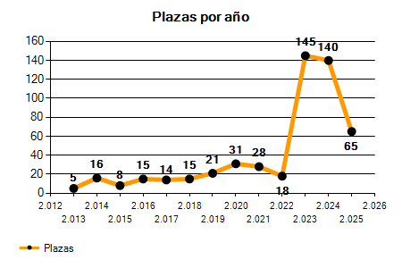 En los siguientes gráficos se puede ver la evolución del número de convocatorias y plazas convocadas por los ayuntamientos de Zamora de los últimos años pudiéndose observar un crecimiento del 380,00% desde el año 2013 hasta el 2025 en número de convocatorias y un crecimiento del 1.200,00% en número de plazas convocadas.