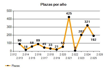 En los siguientes gráficos se puede ver la evolución del número de convocatorias y plazas convocadas por los organismos de la administración local de Alicante de los últimos años pudiéndose observar un crecimiento del 675,00% desde el año 2013 hasta el 2025 en número de convocatorias y un crecimiento del 113,33% en número de plazas convocadas.