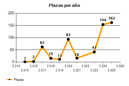 En los siguientes gráficos se puede ver la evolución del número de convocatorias y plazas convocadas por los organismos de la administración local de Almería de los últimos años pudiéndose observar un crecimiento del 5.600,00% desde el año 2015 hasta el 2025 en número de convocatorias y un crecimiento del 16.100,00% en número de plazas convocadas.