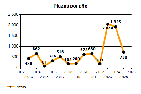 En los siguientes gráficos se puede ver la evolución del número de convocatorias y plazas convocadas por los organismos de la administración local de Andalucía de los últimos años pudiéndose observar un crecimiento del 213,56% desde el año 2013 hasta el 2025 en número de convocatorias y un crecimiento del 67,43% en número de plazas convocadas.