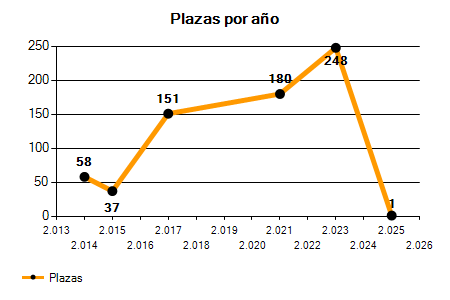 En los siguientes gráficos se puede ver la evolución del número de convocatorias y plazas convocadas por el Consorcio Hospital General Universitario de Valencia de los últimos años pudiéndose observar una caída del 63,64% desde el año 2014 hasta el 2025 en número de convocatorias y una caída del 98,28% en número de plazas convocadas.
