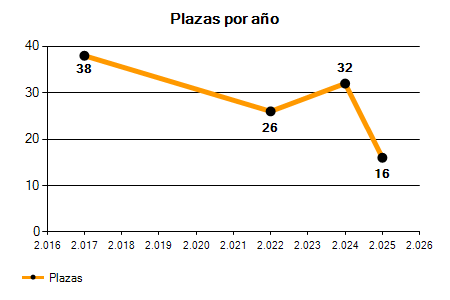 En los siguientes gráficos se puede ver la evolución del número de convocatorias y plazas convocadas por el Consorcio para el Servicio contra incendios y de salvamento de los últimos años pudiéndose observar una caída del 50,00% desde el año 2017 hasta el 2025 en número de convocatorias y una caída del 57,89% en número de plazas convocadas.