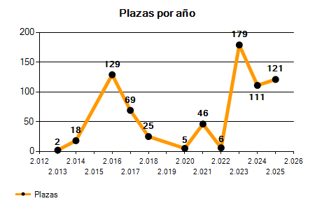 En los siguientes gráficos se puede ver la evolución del número de convocatorias y plazas convocadas por los organismos de la administración local de Córdoba de los últimos años pudiéndose observar un crecimiento del 366,67% desde el año 2013 hasta el 2025 en número de convocatorias y un crecimiento del 5.950,00% en número de plazas convocadas.