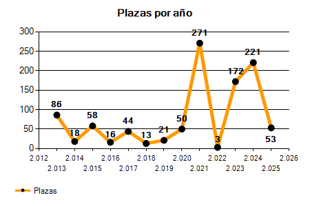 En los siguientes gráficos se puede ver la evolución del número de convocatorias y plazas convocadas por la Diputación Provincial de Alicante de los últimos años pudiéndose observar un crecimiento del 250,00% desde el año 2013 hasta el 2025 en número de convocatorias y una caída del 38,37% en número de plazas convocadas.