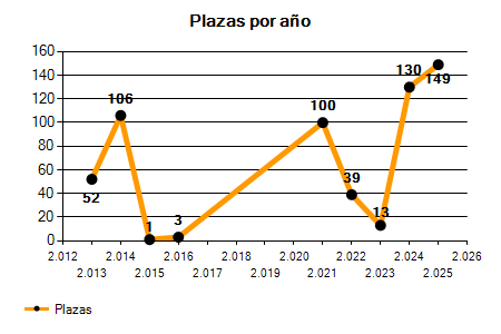 En los siguientes gráficos se puede ver la evolución del número de convocatorias y plazas convocadas por la Diputación Provincial de Granada de los últimos años pudiéndose observar un crecimiento del 3.300,00% desde el año 2013 hasta el 2025 en número de convocatorias y un crecimiento del 186,54% en número de plazas convocadas.
