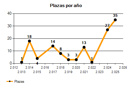 En los siguientes gráficos se puede ver la evolución del número de convocatorias y plazas convocadas por la Diputación Provincial de Lugo de los últimos años pudiéndose observar un crecimiento del 1.200,00% desde el año 2013 hasta el 2025 en número de convocatorias y un crecimiento del 3.400,00% en número de plazas convocadas.