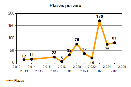 En los siguientes gráficos se puede ver la evolución del número de convocatorias y plazas convocadas por la Diputación Provincial de Valencia de los últimos años pudiéndose observar un crecimiento del 28,57% desde el año 2013 hasta el 2025 en número de convocatorias y un crecimiento del 575,00% en número de plazas convocadas.