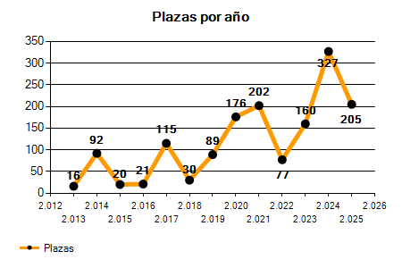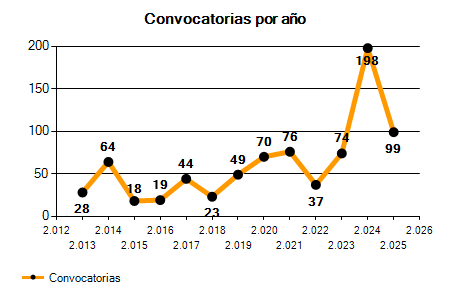En los siguientes gráficos se puede ver la evolución del número de convocatorias y plazas convocadas por los organismos de la administración local de Galicia de los últimos años pudiéndose observar un crecimiento del 253,57% desde el año 2013 hasta el 2025 en número de convocatorias y un crecimiento del 1.181,25% en número de plazas convocadas.