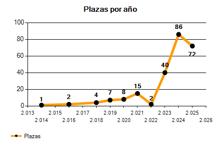 En los siguientes gráficos se puede ver la evolución del número de convocatorias y plazas convocadas por los organismos de la administración local de Madrid de los últimos años pudiéndose observar un crecimiento del 1.700,00% desde el año 2014 hasta el 2025 en número de convocatorias y un crecimiento del 7.100,00% en número de plazas convocadas.