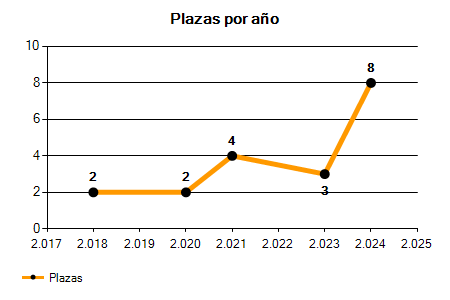 En los siguientes gráficos se puede ver la evolución del número de convocatorias y plazas convocadas por la Mancomunidad de Servicios Sociales del Suroeste de los últimos años pudiéndose observar una caída del 100,00% desde el año 2018 hasta el 2025 en número de convocatorias y una caída del 100,00% en número de plazas convocadas.