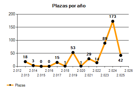 En los siguientes gráficos se puede ver la evolución del número de convocatorias y plazas convocadas por los organismos de la administración local de Teruel de los últimos años pudiéndose observar un crecimiento del 133,33% desde el año 2013 hasta el 2025 en número de convocatorias y un crecimiento del 133,33% en número de plazas convocadas.