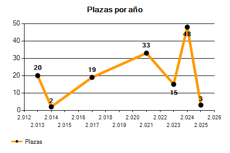 En los siguientes gráficos se puede ver la evolución del número de convocatorias y plazas convocadas por la Universidad de Jaén de los últimos años pudiéndose observar un crecimiento y una caída del 0,00% desde el año 2013 hasta el 2025 en número de convocatorias y una caída del 85,00% en número de plazas convocadas.