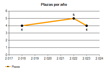 En los siguientes gráficos se puede ver la evolución del número de convocatorias y plazas convocadas para la profesión de Agente de Movilidad en Alicante de los últimos años pudiéndose observar una caída del 100,00% desde el año 2018 hasta el 2025 en número de convocatorias y una caída del 100,00% en número de plazas convocadas.