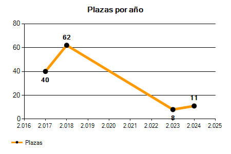 En los siguientes gráficos se puede ver la evolución del número de convocatorias y plazas convocadas para la profesión de Agente de Movilidad en Guipúzcoa de los últimos años pudiéndose observar una caída del 100,00% desde el año 2017 hasta el 2025 en número de convocatorias y una caída del 100,00% en número de plazas convocadas.