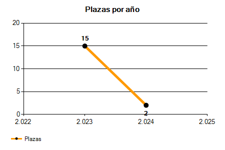 En los siguientes gráficos se puede ver la evolución del número de convocatorias y plazas convocadas para la profesión de Agente en Palmas,Las de los últimos años pudiéndose observar una caída del 100,00% desde el año 2023 hasta el 2025 en número de convocatorias y una caída del 100,00% en número de plazas convocadas.