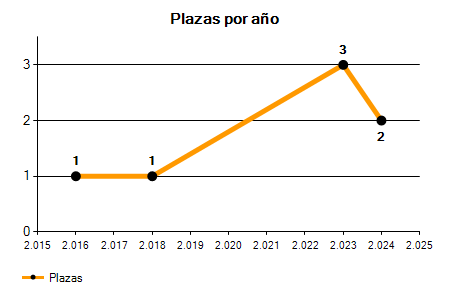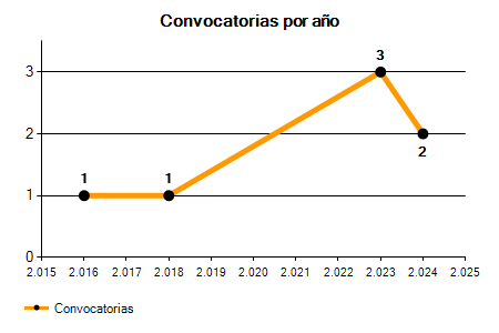 En los siguientes gráficos se puede ver la evolución del número de convocatorias y plazas convocadas para la profesión de Animador en Coruña,A de los últimos años pudiéndose observar una caída del 100,00% desde el año 2016 hasta el 2025 en número de convocatorias y una caída del 100,00% en número de plazas convocadas.