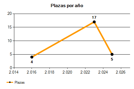 En los siguientes gráficos se puede ver la evolución del número de convocatorias y plazas convocadas para la profesión de Arquitecto en Álava de los últimos años pudiéndose observar un crecimiento del 100,00% desde el año 2016 hasta el 2025 en número de convocatorias y un crecimiento del 25,00% en número de plazas convocadas.