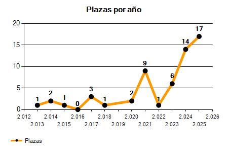 En los siguientes gráficos se puede ver la evolución del número de convocatorias y plazas convocadas para la profesión de Arquitecto en Balears de los últimos años pudiéndose observar un crecimiento del 200,00% desde el año 2013 hasta el 2025 en número de convocatorias y un crecimiento del 1.600,00% en número de plazas convocadas.