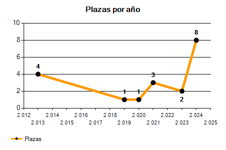 En los siguientes gráficos se puede ver la evolución del número de convocatorias y plazas convocadas para la profesión de Arquitecto en Cáceres de los últimos años pudiéndose observar una caída del 100,00% desde el año 2013 hasta el 2025 en número de convocatorias y una caída del 100,00% en número de plazas convocadas.