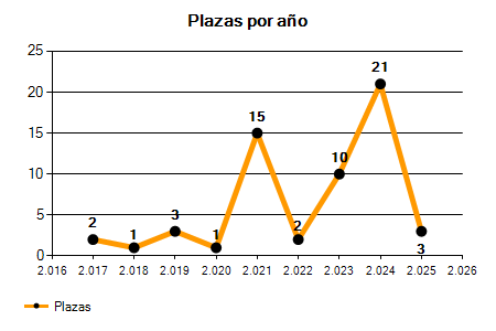 En los siguientes gráficos se puede ver la evolución del número de convocatorias y plazas convocadas para la profesión de Arquitecto en Cádiz de los últimos años pudiéndose observar un crecimiento del 200,00% desde el año 2017 hasta el 2025 en número de convocatorias y un crecimiento del 50,00% en número de plazas convocadas.