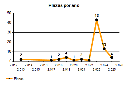 En los siguientes gráficos se puede ver la evolución del número de convocatorias y plazas convocadas para la profesión de Arquitecto en Coruña,A de los últimos años pudiéndose observar un crecimiento y una caída del 0,00% desde el año 2013 hasta el 2025 en número de convocatorias y un crecimiento del 100,00% en número de plazas convocadas.