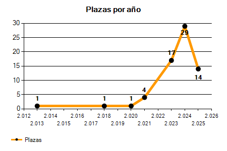 En los siguientes gráficos se puede ver la evolución del número de convocatorias y plazas convocadas para la profesión de Arquitecto en Girona de los últimos años pudiéndose observar un crecimiento del 1.100,00% desde el año 2013 hasta el 2025 en número de convocatorias y un crecimiento del 1.300,00% en número de plazas convocadas.