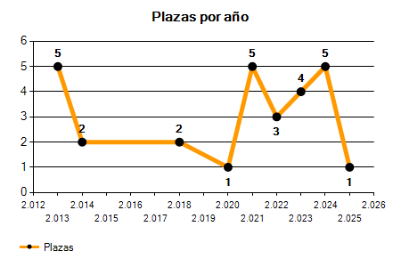 En los siguientes gráficos se puede ver la evolución del número de convocatorias y plazas convocadas para la profesión de Arquitecto en Jaén de los últimos años pudiéndose observar una caída del 66,67% desde el año 2013 hasta el 2025 en número de convocatorias y una caída del 80,00% en número de plazas convocadas.