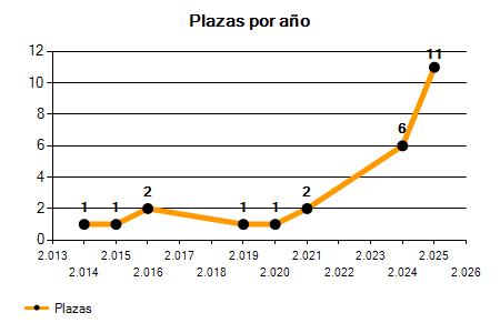 En los siguientes gráficos se puede ver la evolución del número de convocatorias y plazas convocadas para la profesión de Arquitecto en León de los últimos años pudiéndose observar un crecimiento del 700,00% desde el año 2014 hasta el 2025 en número de convocatorias y un crecimiento del 1.000,00% en número de plazas convocadas.