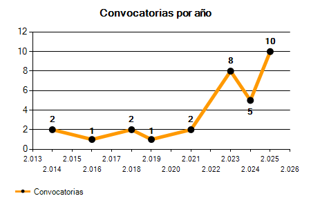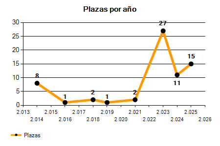 En los siguientes gráficos se puede ver la evolución del número de convocatorias y plazas convocadas para la profesión de Arquitecto en Málaga de los últimos años pudiéndose observar un crecimiento del 400,00% desde el año 2014 hasta el 2025 en número de convocatorias y un crecimiento del 87,50% en número de plazas convocadas.