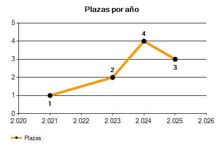 En los siguientes gráficos se puede ver la evolución del número de convocatorias y plazas convocadas para la profesión de Arquitecto en Segovia de los últimos años pudiéndose observar un crecimiento del 100,00% desde el año 2021 hasta el 2025 en número de convocatorias y un crecimiento del 200,00% en número de plazas convocadas.