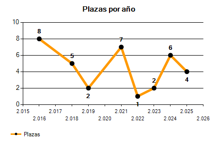En los siguientes gráficos se puede ver la evolución del número de convocatorias y plazas convocadas para la profesión de Arquitecto en Valladolid de los últimos años pudiéndose observar un crecimiento del 33,33% desde el año 2016 hasta el 2025 en número de convocatorias y una caída del 50,00% en número de plazas convocadas.