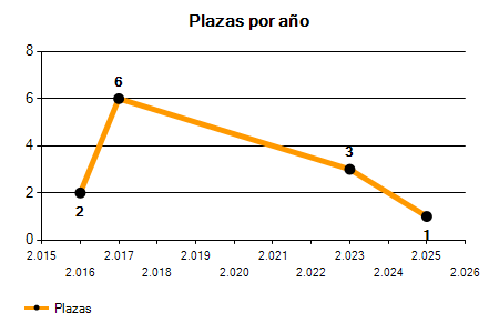 En los siguientes gráficos se puede ver la evolución del número de convocatorias y plazas convocadas para la profesión de Asistente Social en Guipúzcoa de los últimos años pudiéndose observar una caída del 50,00% desde el año 2016 hasta el 2025 en número de convocatorias y una caída del 50,00% en número de plazas convocadas.