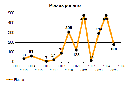 En los siguientes gráficos se puede ver la evolución del número de convocatorias y plazas convocadas para la profesión de Auxiliar administrativo en Barcelona de los últimos años pudiéndose observar un crecimiento del 96,15% desde el año 2013 hasta el 2025 en número de convocatorias y un crecimiento del 445,45% en número de plazas convocadas.