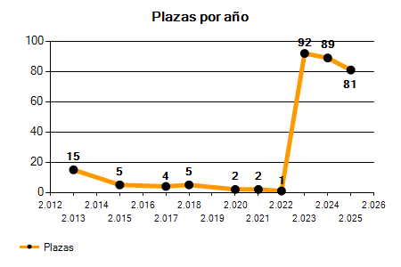 En los siguientes gráficos se puede ver la evolución del número de convocatorias y plazas convocadas para la profesión de Auxiliar administrativo en Castellón de la Plana de los últimos años pudiéndose observar un crecimiento del 475,00% desde el año 2013 hasta el 2025 en número de convocatorias y un crecimiento del 440,00% en número de plazas convocadas.