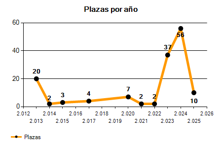 En los siguientes gráficos se puede ver la evolución del número de convocatorias y plazas convocadas para la profesión de Auxiliar administrativo en Ourense de los últimos años pudiéndose observar un crecimiento del 125,00% desde el año 2013 hasta el 2025 en número de convocatorias y una caída del 50,00% en número de plazas convocadas.