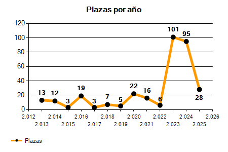 En los siguientes gráficos se puede ver la evolución del número de convocatorias y plazas convocadas para la profesión de Auxiliar administrativo en Pontevedra de los últimos años pudiéndose observar un crecimiento del 66,67% desde el año 2013 hasta el 2025 en número de convocatorias y un crecimiento del 115,38% en número de plazas convocadas.