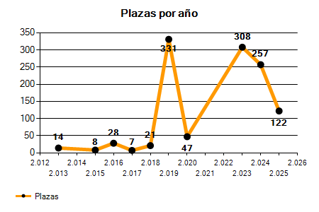 En los siguientes gráficos se puede ver la evolución del número de convocatorias y plazas convocadas para la profesión de Auxiliar administrativo en Santa Cruz de Tenerife de los últimos años pudiéndose observar un crecimiento del 128,57% desde el año 2013 hasta el 2025 en número de convocatorias y un crecimiento del 771,43% en número de plazas convocadas.