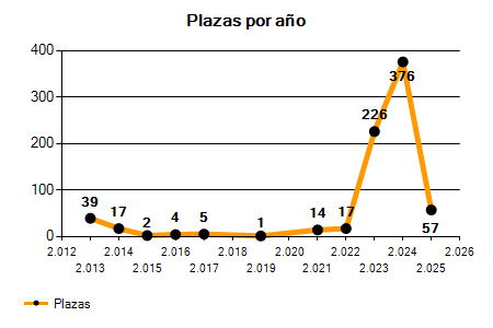 En los siguientes gráficos se puede ver la evolución del número de convocatorias y plazas convocadas para la profesión de Auxiliar administrativo en Tarragona de los últimos años pudiéndose observar un crecimiento del 130,00% desde el año 2013 hasta el 2025 en número de convocatorias y un crecimiento del 46,15% en número de plazas convocadas.
